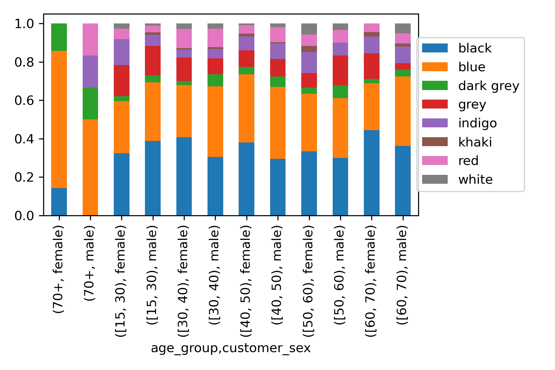 Пол - возраст - цветsex_age_model_df = df.groupby(['age_group','customer_sex', 'color'])['ind'].sum().unstack('color').fillna(0) sex_age_color_df = sex_age_model_df.divide( df.groupby( by=['age_group','customer_sex'] )['ind'].sum(), axis=0 )ax=sex_age_color_df.plot.bar(stacked=True) ax.legend(loc='center right', bbox_to_anchor=(1.3, 0.5), ncol=1)