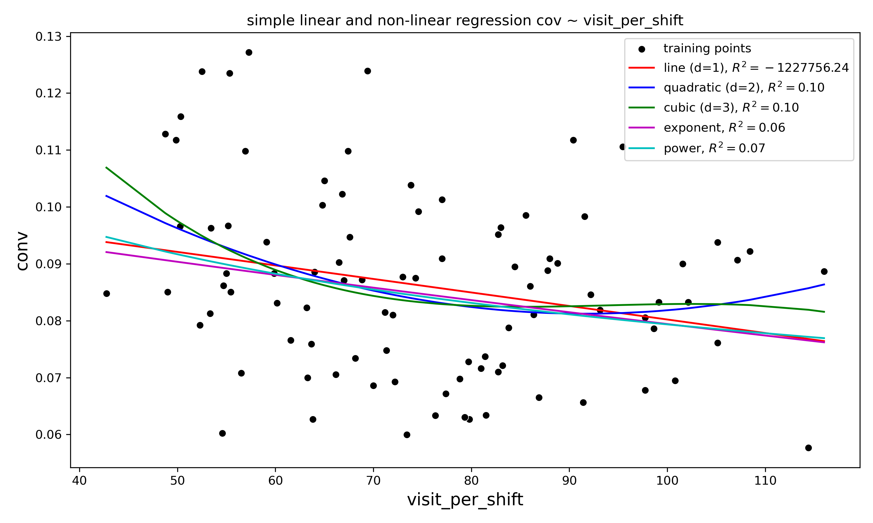 print(f'Root Mean Squared Error = {quad_rmse:.2f}')Decision Quadratic Regression Metrics: R^2 Score = 0.096 Mean Absolute Percentage Error = 14.84 Mean Absolute Error = 0.01 Mean Squared Error = 0.00 Root Mean Squared Error = 0.02X_cub = PolynomialFeatures(degree=3).fit_transform(X) regr = regr.fit(X_cub, y) y_cub_fit = regr.predict(X_cub) # Рассчитываем метрики качества cub_mae = metrics.mean_absolute_error(y, y_cub_fit) cub_mse = metrics.mean_squared_error(y, y_cub_fit) cub_mape = MAPE(y, y_cub_fit) cub_rmse = math.sqrt(cub_mse) cub_r2 = metrics.r2_score(y, y_cub_fit) # Выводим метрики print('Decision Cubic Regression Metrics:') print(f'R^2 Score = {cub_r2:.3f}') print(f'Mean Absolute Percentage Error = {cub_mape:.2f}') print(f'Mean Absolute Error = {cub_mae:.2f}') print(f'Mean Squared Error = {cub_mse:.2f}') print(f'Root Mean Squared Error = {cub_rmse:.2f}')Decision Cubic Regression Metrics: R^2 Score = 0.101 Mean Absolute Percentage Error = 14.83 Mean Absolute Error = 0.01 Mean Squared Error = 0.00 Root Mean Squared Error = 0.02Не ограничимся этим, и используем експоненциальную и степенную модели#Экспоненциальная модель y=ab^xy_log=np.log(y) regr = regr.fit(X, y_log) y_exp_fit = regr.predict(X) # Рассчитываем метрики качества exp_mae = metrics.mean_absolute_error(y, np.exp(y_exp_fit)) exp_mse = metrics.mean_squared_error(y, np.exp(y_exp_fit)) exp_mape = MAPE(y, np.exp(y_exp_fit)) exp_rmse = math.sqrt(exp_mse) exp_r2 = metrics.r2_score(y, np.exp(y_exp_fit)) # Выводим метрики print('Decision Exp Regression Metrics:') print(f'R^2 Score = {exp_r2:.3f}') print(f'Mean Absolute Percentage Error = {exp_mape:.2f}') print(f'Mean Absolute Error = {exp_mae:.2f}') print(f'Mean Squared Error = {exp_mse:.2f}') print(f'Root Mean Squared Error = {exp_rmse:.2f}')Decision Exp Regression Metrics: R^2 Score = 0.059 Mean Absolute Percentage Error = 14.89 Mean Absolute Error = 0.01 Mean Squared Error = 0.00 Root Mean Squared Error = 0.02#Степенная модель y=ax^by_log=np.log(y) X_log=np.log(X) regr = regr.fit(X_log, y_log) y_pow_fit = regr.predict(X_log) # Рассчитываем метрики качества pow_mae = metrics.mean_absolute_error(y, np.exp(y_pow_fit)) pow_mse = metrics.mean_squared_error(y, np.exp(y_pow_fit)) pow_mape = MAPE(y, np.exp(y_pow_fit)) pow_rmse = math.sqrt(pow_mse) pow_r2 = metrics.r2_score(y, np.exp(y_pow_fit)) # Выводим метрики print('Decision Power Regression Metrics:') print(f'R^2 Score = {pow_r2:.3f}') print(f'Mean Absolute Percentage Error = {pow_mape:.2f}') print(f'Mean Absolute Error = {pow_mae:.2f}') print(f'Mean Squared Error = {pow_mse:.2f}') print(f'Root Mean Squared Error = {pow_rmse:.2f}')Decision Power Regression Metrics:R^2 Score = 0.070 Mean Absolute Percentage Error = 14.88 Mean Absolute Error = 0.01 Mean Squared Error = 0.00 Root Mean Squared Error = 0.02Чтобы лучше представить, что у нас получилось, выведем графикиplt.figure(figsize=(10,6)) sns.scatterplot(x=X[:,0], y=y,label='training points', color='k') sns.lineplot(x=X[:,0], y=y_lin_fit,label='line (d=1),$R^2={:.2f}$'.format(lin_r2),color = 'r') sns.lineplot(x=X[:,0], y=y_quad_fit,label='quadratic (d=2),$R^2={:.2f}$'.format(quad_r2),color = 'b') sns.lineplot(x=X[:,0], y=y_cub_fit,label='cubic (d=3),$R^2={:.2f}$'.format(cub_r2),color = 'g') sns.lineplot(x=X[:,0], y=np.exp(y_exp_fit),label='exponent,$R^2={:.2f}$'.format(exp_r2),color='m') sns.lineplot(x=X[:,0], y=np.exp(y_pow_fit),label='power,$R^2={:.2f}$'.format(pow_r2),color='c') plt.xlabel("visit_per_shift", fontsize=14) plt.ylabel("conv", fontsize=14) plt.legend(loc='upper right') plt.xlabel('visit_per_shift') plt.ylabel('conv') plt.title('simple linear and non-linear regression cov ~ visit_per_shift')model_name=['line (a+b*x)','quadratic (a+b1*x+b2*x^2)','cubic (a+b1*x+b2*x^2+b3*x^3)','exponent (a*b^x)','power (a*x^b)',''] fig, axs = plt.subplots(3, 2, figsize=(12, 10), sharey=True) plt.subplots_adjust(hspace=0.5) axs[0,0].scatter(X[:,0], y - y_lin_fit,c='steelblue', marker='o', edgecolor='white',label='line') axs[0,1].scatter(X[:,0], y - y_quad_fit,c='g', marker='s', edgecolor='white',label='line') axs[1,0].scatter(X[:,0], y - y_cub_fit,c='r', marker='h', edgecolor='white',label='line') axs[1,1].scatter(X[:,0], y - np.exp(y_exp_fit),c='m', marker='H', edgecolor='white',label='line') axs[2,0].scatter(X[:,0], y - np.exp(y_pow_fit),c='b', marker='8', edgecolor='white',label='line') fig.delaxes(axs[2,1]) for i,ax in enumerate(axs.flat): ax.set(xlabel='visit_per_shift', ylabel='residual') ax.axhline (y = 0, color = 'b') ax.set_title("model "+model_name[i])